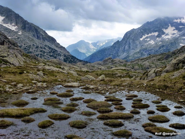 After observing the spectacular reflections on the water of the mountains of the place where we spent the night ... It seems that we will have a sunny day and we have to enjoy it! We try to leave the Refuge by the Estany de la Cabana (Lake of the Hut) for not to undo the yesterdays path way, and after a small time of deviation, we achieve again the path that leads to the Monestero pass. From there begins a long descent to Lake St. Maurici through a landscape of extreme beauty and grandeur.